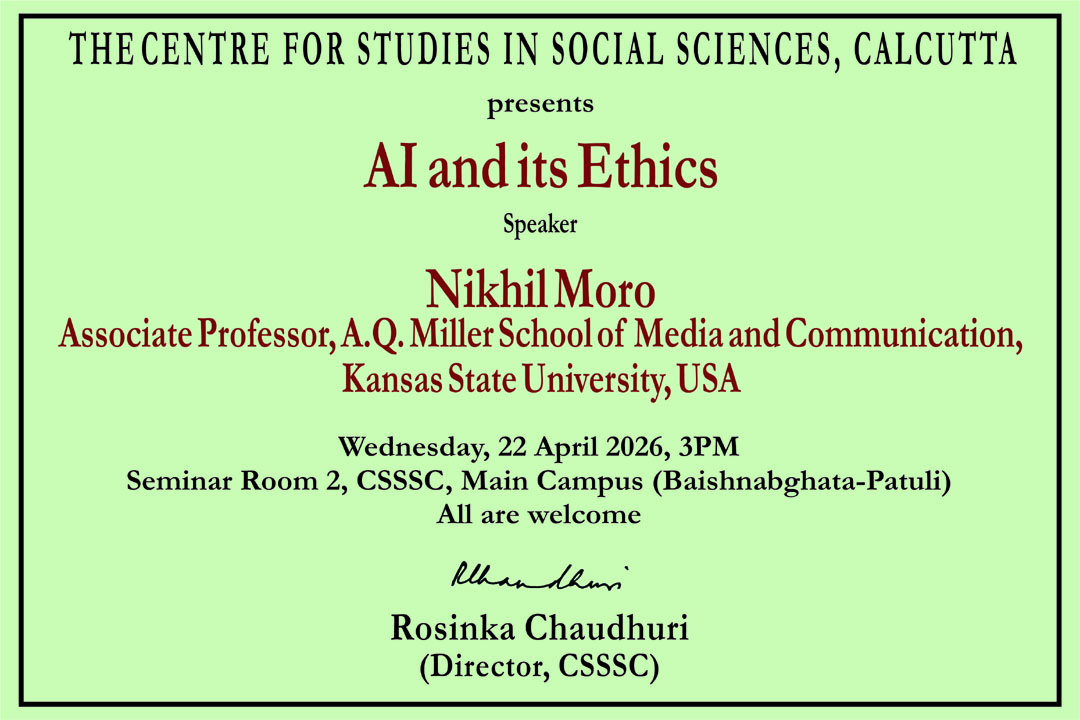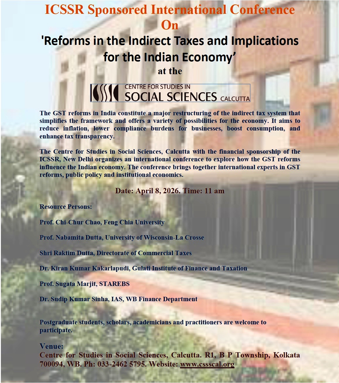 The Centre for Studies in Social Sciences, Calcutta, was founded in February 1973. Financed primarily by matching grants from the ICSSR and the Government of West Bengal, the Centre has full academic autonomy, is designed to function democratically and is proud of its impeccable record of public accountability.