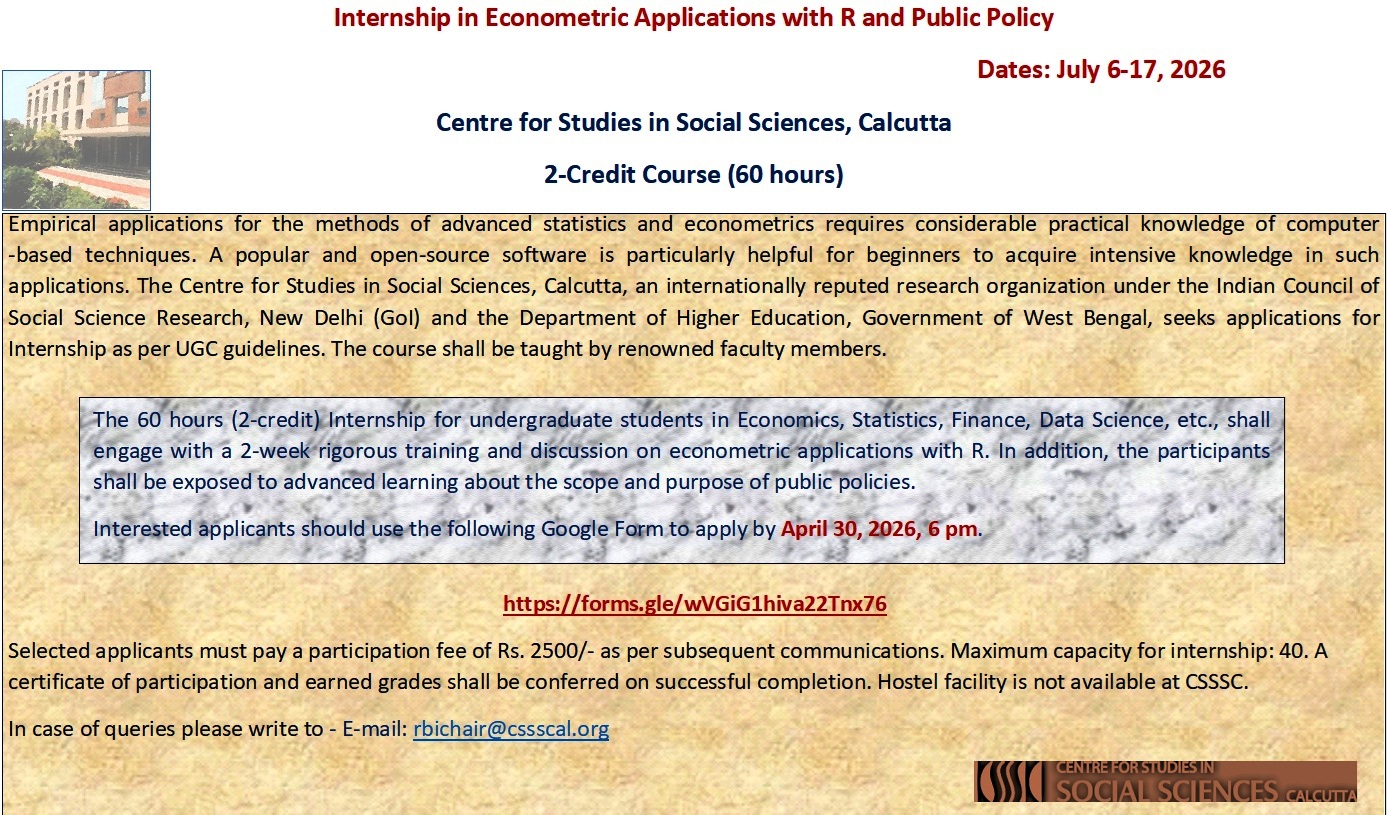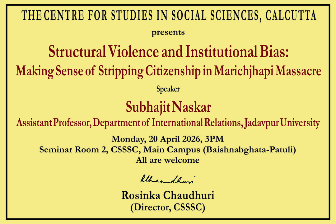 The Centre for Studies in Social Sciences, Calcutta, was founded in February 1973. Financed primarily by matching grants from the ICSSR and the Government of West Bengal, the Centre has full academic autonomy, is designed to function democratically and is proud of its impeccable record of public accountability.
